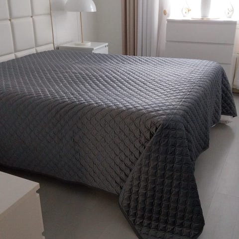 Myydään vaaleanharmaa päiväpeite. Materiaali samettia.