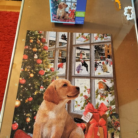 Otter Housen valmistama 1000 palan palapeli, jossa on Pollyanna Pickeringin "Songs of the Season" -lintukuvio. Koottu kerran ja purettu heti takaisin laatikkoon.