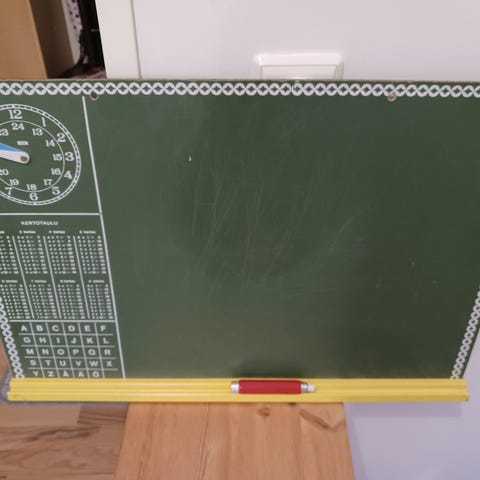 Ikean liitutaulu"tarra", jonka saa kiinnitettyä vaikkapa kaapin oveen ja irtoaa helposti. Koko n. 40x50 cm (mittaa en just nyt löytänyt...)