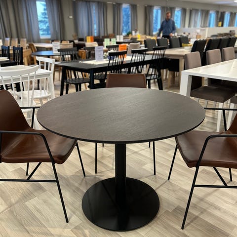 Pohjanmaan Kalusteen 100 cm halkaisijaltaan oleva pyöreä ruokapöytä ja 4 kpl verhoiltuja Mood ruokatuoleja.
