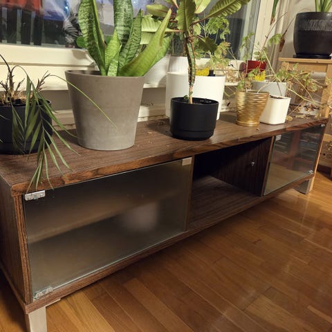 Hyväkuntoinen lasinen tv-taso.