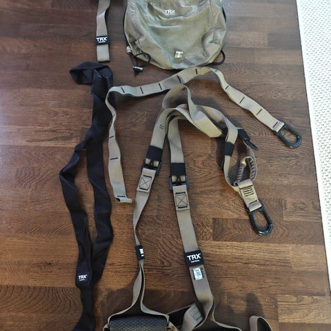 Hyvässä kunnossa olevat trx-remmit sisä- tai ulkotreeniim. Saa myös ankkuroitua oveen. Muksna pakallinen ohjekortteja liikkeisiin.