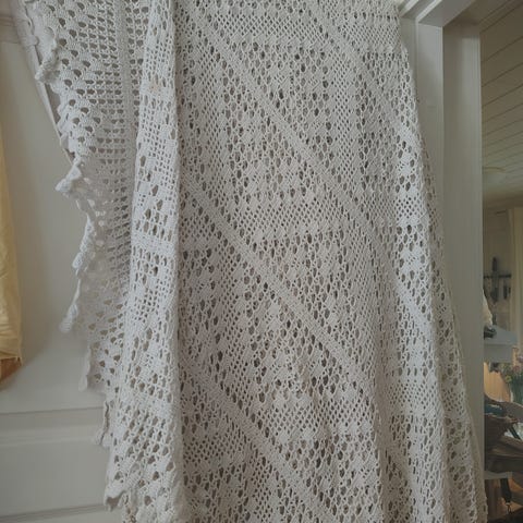 Käsityönä kudottu parisängyn pitsiunelma- päiväpeitto, puuvillalankaa