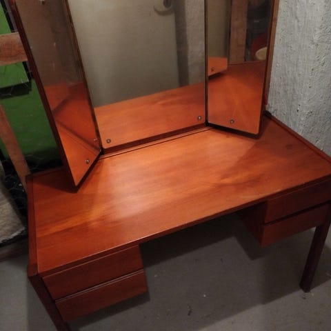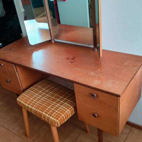 Myydään näyttävä kampauspöytä, jossa upea kolmiosainen peili ja koristeelliset yksityiskohdat. Pöydässä on viisi tilavaa laatikkoa, joissa kauniit metallivetimet ja kaiverrukset. Tyylikkäät kaarevat jalat ja klassinen muotoilu tekevät tästä huonekalusta arvokkaan sisustuselementin makuuhuoneeseen tai pukeutumistilaan.