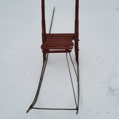 Perinteinen potkukelkka, jonka puuosat ja muu hyvässä kunnossa. Sininen väri ollut ”väärä”. Pohja on puhdasta puuta.