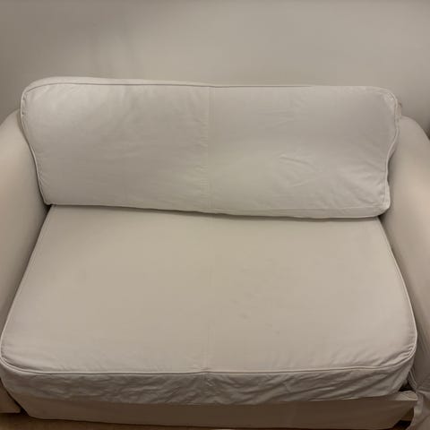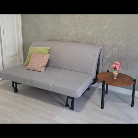 Nätti vuodesohva. Selkänojan saa mukaan. Siinä värjäymää ja repeymä reunassa, voi saada kuntoon. Kaksi sälettä kiinnitettävä uudelleen pohjaan. Saat säleet mukaan. Patja ei kuulu kauppaan.