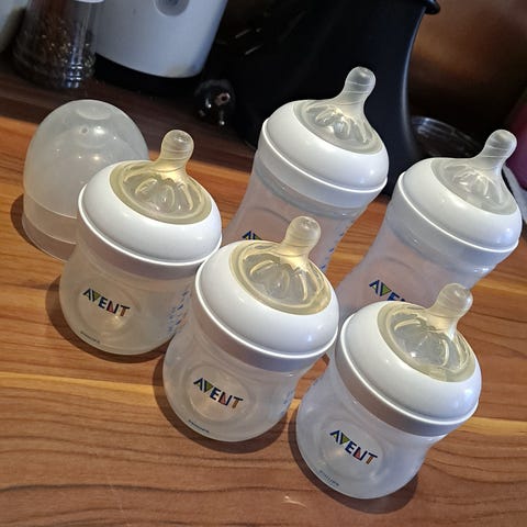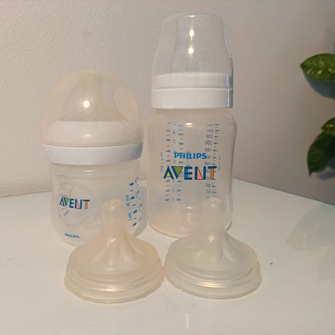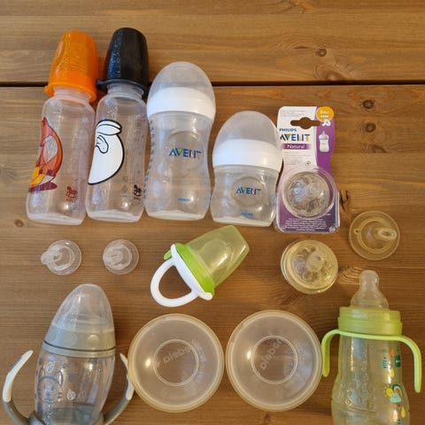 Settinä yhteensä 4 uudempaa, pyöreämmän mallistaja pulloa ja 3 vanhempaa joissa ei korkkia. Yhteensopuvat ristiin. Lisäksi 1 avent kuppi vielä mukaan. Käytettyjä mutta pesty ja desinfioitu aina käytön jälkeen. Tuttiosat heitetty pois.