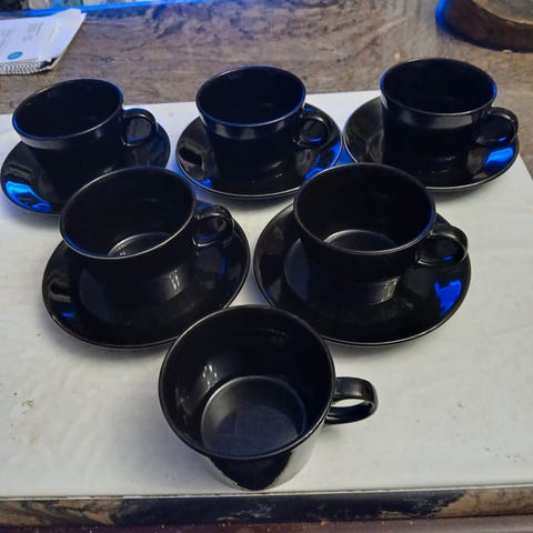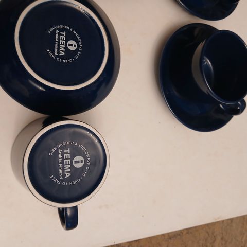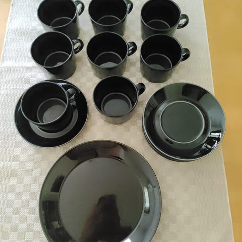 Arabia astiaston osat sisältäen 10 kpl keltaisia kuppeja ja 7 kpl isoja lautasia. Koko setti 100 €, mukit erikseen 50 €, lautaset erikseen 70 €.
