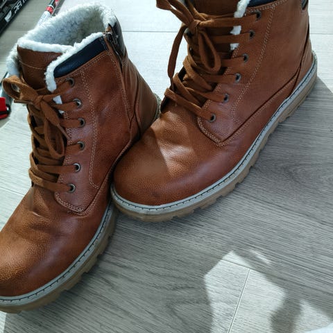 Hinta on alhainen, koska nahkapinta on oikean kengän päässä kulunut ja vaaleampi nahka näkyy. Katso kuvat tarkemmin. Tummanruskealla rasvalla korjaantuu. Muutoin moitteetomassa kunnossa.