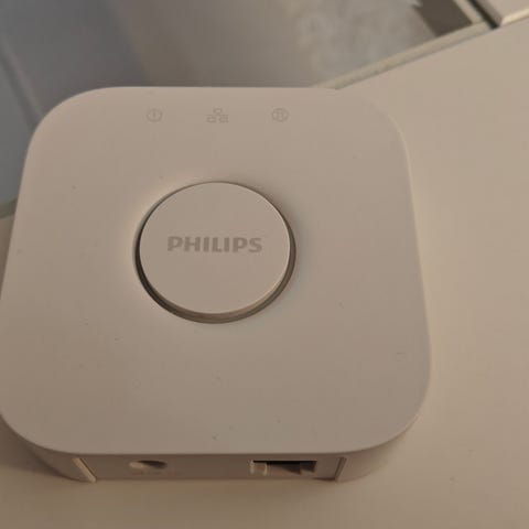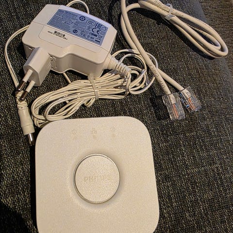 Philips Hue reititin, valkoinen väri. Mukana virtalähde ja verkkokaapeli. Käytetään Philips Hue -älyvalaistusjärjestelmän hallintaan ja verkon laajentamiseen.