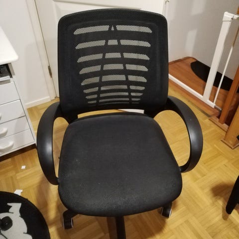 Toimistotuoli kangaspäällysteellä ja pyörillä varustetulla jalustalla.