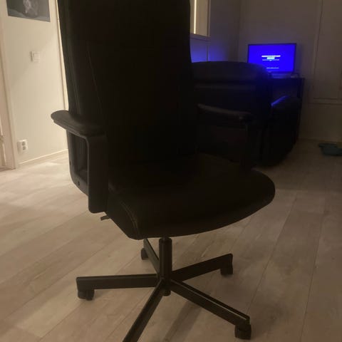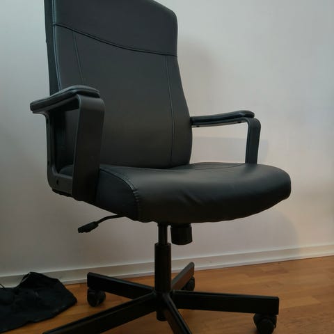 Ikean kankainen tummanharmaa työtuoli pyörillä. Istuinkorkeus on säädettävissä, 42-53cm. Istuinsyvyys 37cm. Matalimmassa asennossa selkänojan korkeus 81cm, käsinojien 66cm. Tuoli on hyvässä kunnossa.