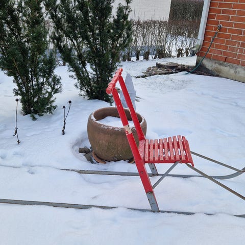 Vanha, punaiseksi maalattu, potkukelkka. Toinen jalas vähän vääntynyt, mutta ei haittaa käyttöä (näkyy kuvassa). Työntöaisan korkeus n. 70 cm, jalaksen pituus n. 180 cm.
