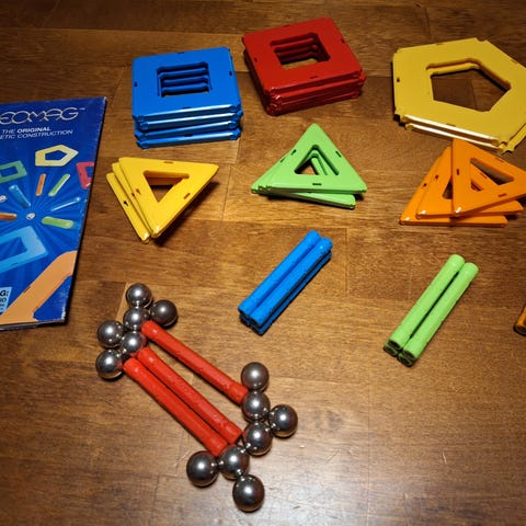 Geomag magneettileikki osat sisältävät sinisiä ja oransseja muovisia levyjä, sekä keltaisia, sinisiä ja ruskeita magneettisia tankoja ja metallipalloja. Osat soveltuvat magneettisille rakennusleikeille ja rakenteiden kokoamiseen. Mukaan tulee myös säilytysrasia.