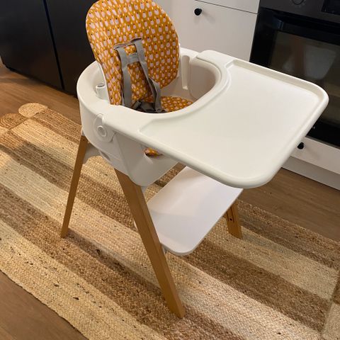 Yhdellä lapsella käytössä ollut Stokke Steps -tuoli säädettävällä jalkaosalla. Savuton ja lemmikkieläimetön koti. Pieniä käytön jälkiä, mutta siisti yleisilme.