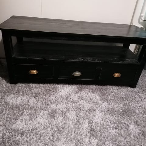 Puinen TV-taso. Yksi laatikon lasi puuttuu.