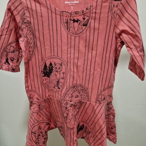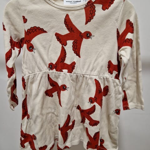 Mini Rodini lasten mekko koossa 92, väriltään punainen. Joustamatonta puuvillaa, pitkähihaiset hihat sekä napit takana. Mekossa on koirakuosi. Eläimetön ja savuton talous.
