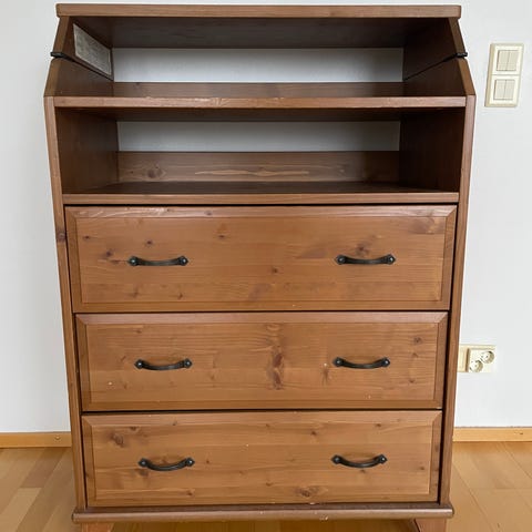OK kunnossa oleva hoitopöytä tilavilla laatikoilla. Vaipanvaihtoalusta.