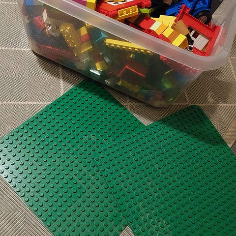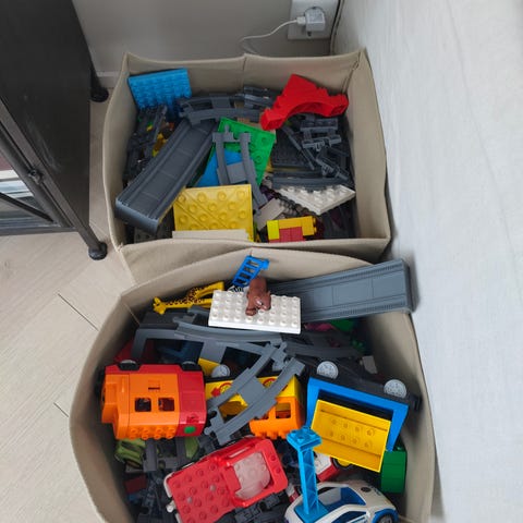 Paljon erilaisia lego dubloja,taloa, rakennusalevyjä ja yksi pipsa possu lego dublo