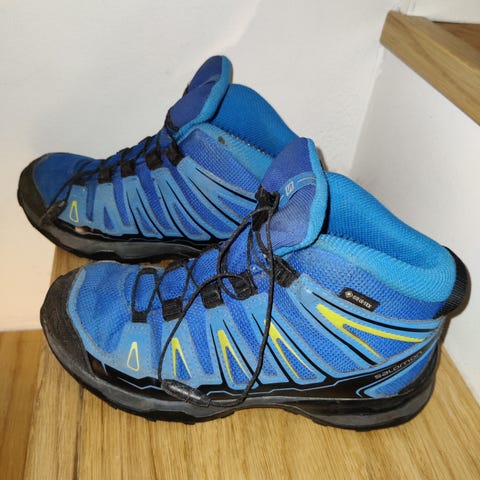 Salomon Goretex kengät koossa 35. Sisämitta 22,5cm. Hyväkuntoiset, toimivat ja lämpimät. Vasemman kengän läpän uloimmassa kankaassa pieni repeytyminen, joka ei vaikuta kenkien toimivuuteen.