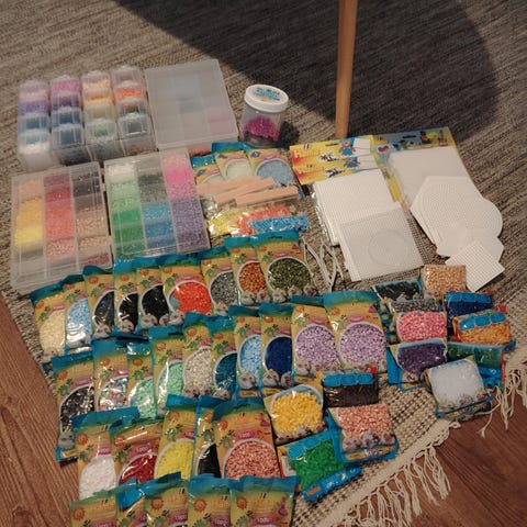 Todella paljon erivärisiä HAMA helmiä, alustoja ja silityspaperia.