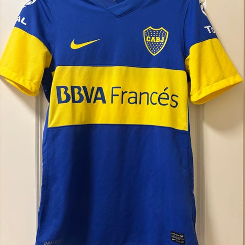 Boca Juniorsin tummansininen treenipaita pienellä vetoketjulla. Nike-merkkinen, koko M. Etupuolen mainos kulunut, muuten hyvässä kunnossa.