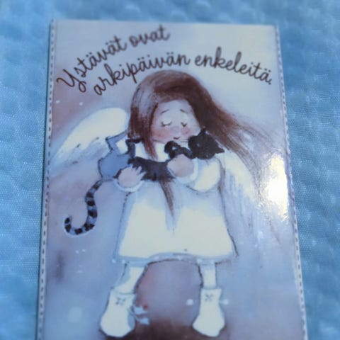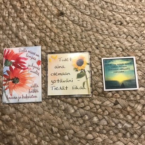 Kaksi erilaista maatuska mangeettia, kukkaruukku, perhonen, 2 enkeliä magneetti, Englannin lakritsi, jossa teksti:" Pieni herkkuhetki on aina paikallaan", tyttö sydän kädessään ja hollannikkaat jalassa, tyttö kukkamekko päällä ja keltainen kukka essu, viikinki, koira magneetti, nalle säkkipillinsoittaja ja hauska lehmä kukka suussa. Jalat ovat langalla kiinni joten ne heiluvat.