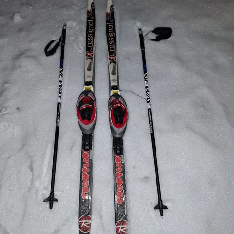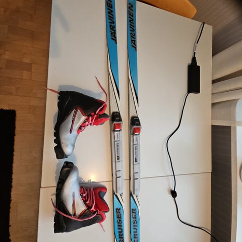 Lasten murtomaasukset, mitta 120 cm. Pohjissa naarmuja, kaipaavat pitovoidetta tai - teippiä. Helppokäyttöiset Salomon Profil SNS-siteet.