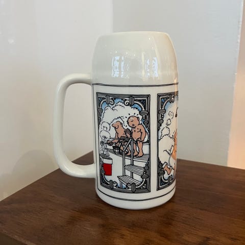 Käsinmaalattu koriste NB-mallin mukiin, tilavuus 4 dl, korkeus 10 cm, mukeissa käytön ja iän jälkeä.