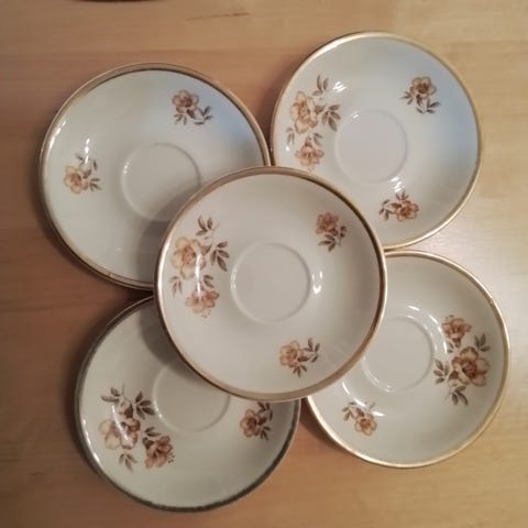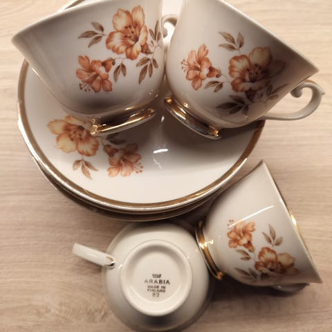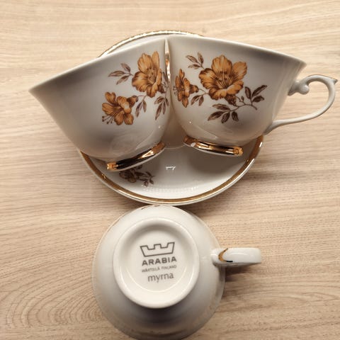 Arabia, Olga Osol, kupit ja aluslautaset 1981-2014 tuotantoa, ehjät ja kultaukset virheettömät, vanhat pullalautaset kaupan päälle