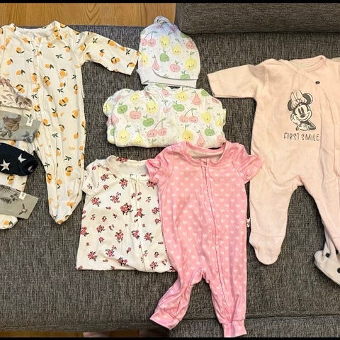 Vastasyntyneelle/pienelle vauvalle lämmintä vaatetta. Newbien lämmin pussihuppari, pari pipoa, toinen Reiman, mummon neuloma ihana villatakki ja villasukat. Matkaan saa myös äityspakkauksesta tulleen apinalämpöpussin ja baby björnin bip-ruokalapun.