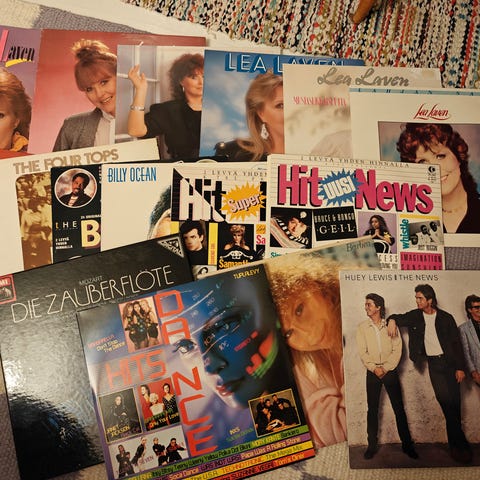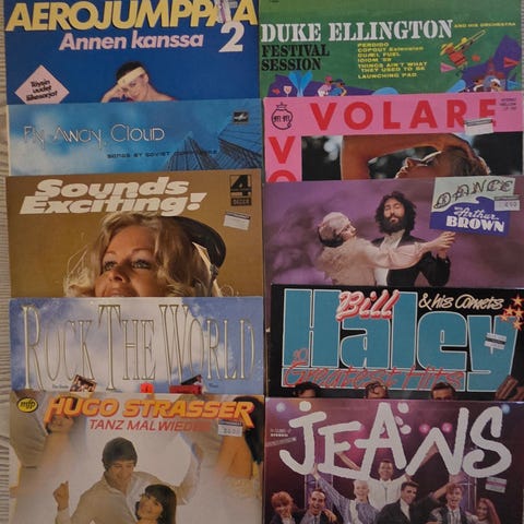 Sekalainen LP-levykokoelma, joka sisältää useiden eri artistien ja genrejen albumeita. Yhteensä 60 levyä kerralla matkaan.