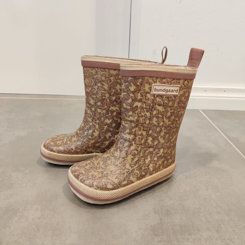 Bundgaard Charly lämminvuoriset kumisaappaat. Koko 21 ja sisämitta myyjäliikkeen verkkosivujen mukaan 14,2cm. Alkuperäisten paksujen ja kovien pohjallisten tilalle vaihdettu alumiinivillapohjalliset, mutta alkuperäiset saa mukaan.