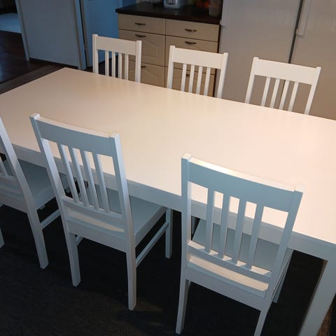 Myydään hyväkuntoinen Vekestä ostettu ruokailuryhmä. Pöytä jatkettava (pituus jatkettuna noin 178cm, tuoleja 6 kpl. Pientä käytön jälkeä on. Eläintalous, penkit pestään ennen kauppoja tekstiilipesurilla.