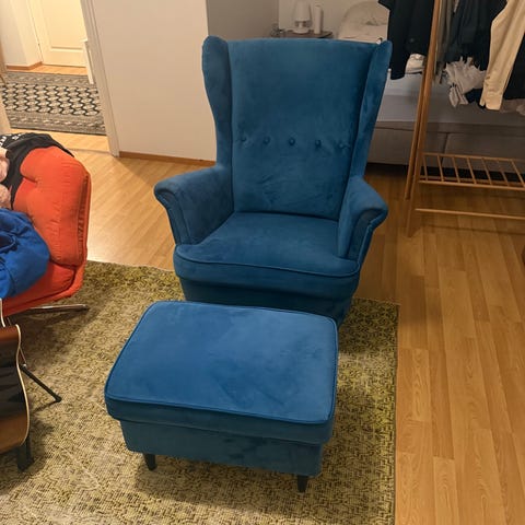 Ikean STRANDMON nojatuoli, irrotettavat pestävät päälliset. Päällisten alla tummanvihreä nojatuoli, mutta käsinojien pinta niin kulunut, jonka vuoksi ostettu päälliset.