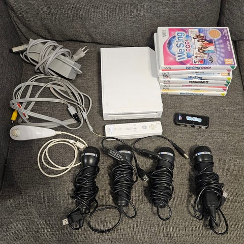 Alkuperäinen virtalähde ja videojohto tulevat mukaan. Mukaan ei tule peliohjainta eikä sensoripalkkia. Niitä saatavilla uudistuotantona edullisesti. Alkuperäiset eivät taidakaan enää olla parhaimmillaan.