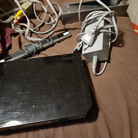 Musta wii-pelikonsoli, virta-adapteri, video-johto sekä testilevy