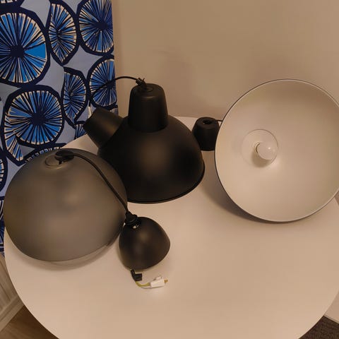 Ikean Ottava- riippuvalaisimet. Siistikuntoiset, ei naarmuja pinnoissa. Lasiset valaisinkuvut puuttuu mutta hienot myös ilman niitä.