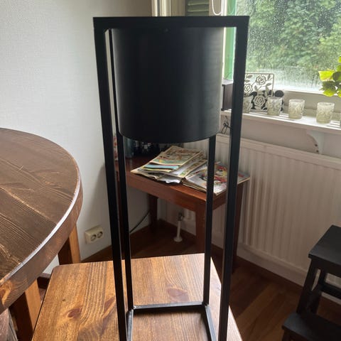 Musta, metallinen, kevyt, kapea laatikko jaloilla