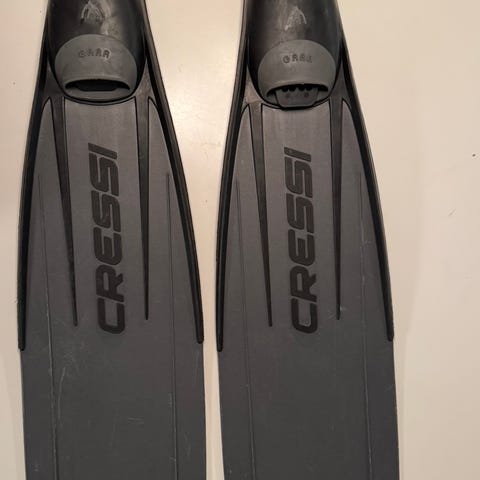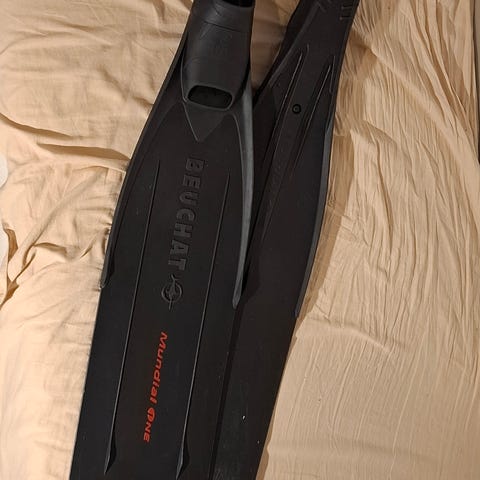Siistikuntoiset, melko vähän käytetyt vapaasukellusräpylät hiilikuituisilla lavoilla. Tehtaalla asennettu suojakalvot. Medium jäykkyys. Koko ehkäpä lähempänä 43. Mukaan sukat tai puolisukat jos tarpeen.