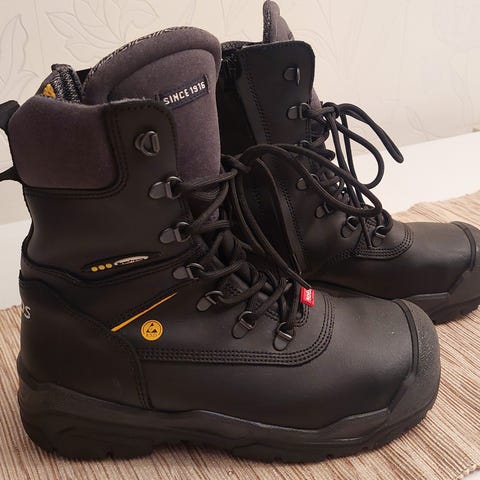 Jalas työ/keittiöjalkineet koossa 39. Mustat kengät, joissa tarrakiinnitys ja kumipohja. Soveltuvat monipuoliseen käyttöön, erityisesti työkäyttöön tai tilanteisiin, joissa tarvitaan tukevat ja kestävät jalkineet.