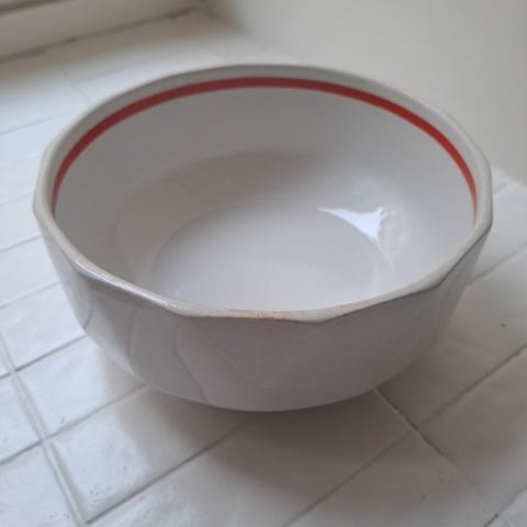Vanha Arabian M-mallin kulho, jossa on punainen reunus. Halkaisija 20 cm.