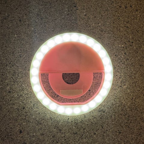 Ringlight, 3lla värillä ja +/- säädöllä. Perusjalka -liitännällä. Säädettävä puhelimenpidike.