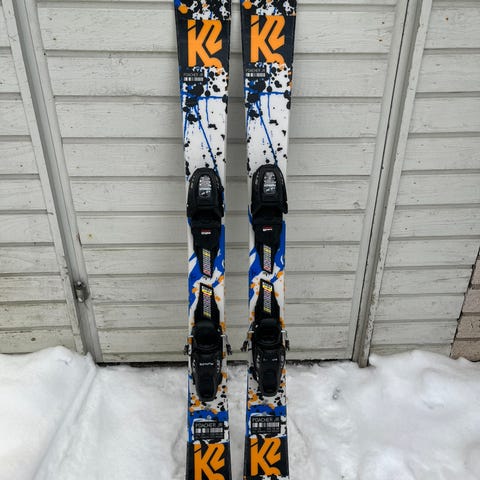 Lasten K2 twintip laskettelusukset Markerin siteillä. Suksien pituus 109cm. Pohjat eivät ole priimakunnossa, mutta ei ole meidän lapsen laskemiseen vaikuttanut.