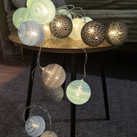Kaksi samantyylistä pallovalosarjaa myydään yhdessä. Molemmissa valkoisia ja harmaita palloja, toisessa myös mustia palloja. Kaikki valot ehjiä ja pallot myös, parista pallosta narunpätkä on lähtenyt pinnasta irti (katso kuva 3), mutta saa helposti liimattua / muuten kiinnitettyä takaisin pallon pintaan. Molemmissa on töpselit ja noin 3 metriä pitkä sähköjohto + pari metriä pallosarjaa.