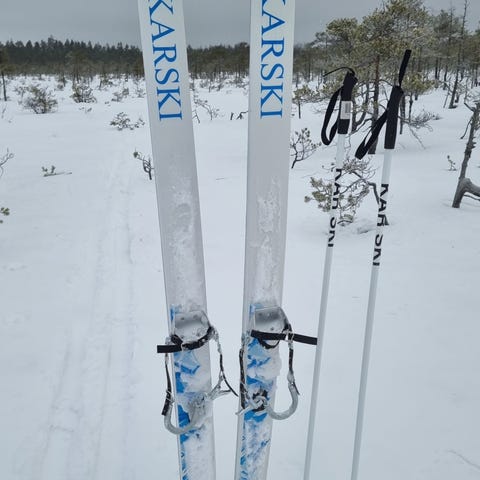 Karski sukset, siteet ja sauvat, myös toiset siteet mukan. Joku käytönjälki löytyy.