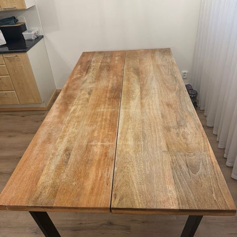 Massiivipuuta oleva lankkupöytä mittatilaustyönä tilattu pienyrittäjältä. Ollut minulla käytössä noin 5 vuotta joten pientä käytön jälkeä on mutta ei mitään kummempaa.