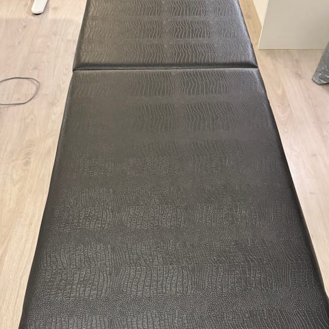 3-osainen hierontapöytä, jossa on musta verhoilu ja puujalat. Pöytä sisältää kasvoaukollisen pään tuen. Kuvassa näkyvät käsituet puuttuvat.