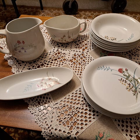4 kappaletta pellervo-kuviolla, 2 valkoista samaa mallia. Pellervoista kahdessa selkeää halkeamaa, joka näkyy kuvissa, muut ikäisekseen hyvässä kunnossa. Tarjoa koko setistä yhteensä, tai haluamistasi lautasista