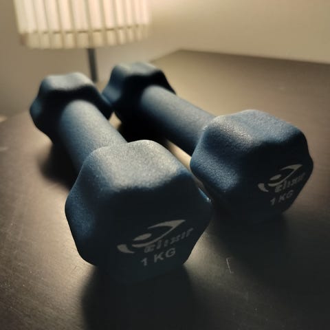 Käsipainot, paino 2 x 3 kg. Materiaalina harmaa muovi. Saaneet vähän runtua, mutta vielä kelpaa jumpata.